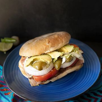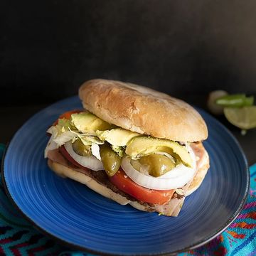 A Mexican sandwich made with telera bread, filled with refried beans, your choice of meat, lettuce, tomato, onions, avocado and pickled jalapeños
