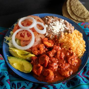 Shrimp cooked in extremely spicy chile de arbol sauce served with rice, refried beans and salad with your choice of corn or flour tortillas.