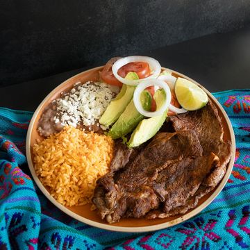 A thin-sliced steak grilled served with rice, beans, salad and your choice of flour or corn tortillas.