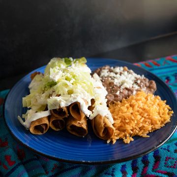 Corn tortilla rolled and fried with chicken or cheese topped with lettuce , sour cream, queso fresco and a side of rice and beans.