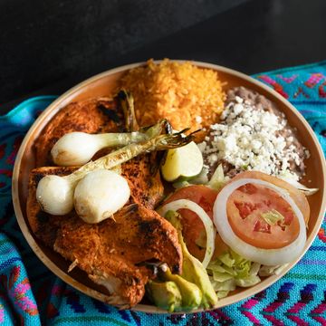 Grilled chicken marinated in adobo sauce and served with rice, beans, salad and your choice of flour or corn tortillas.