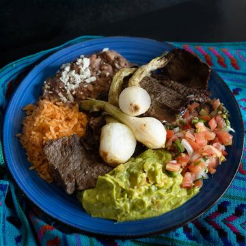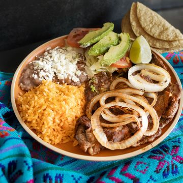 Grilled skirt steak, served with grilled onions, guacamole, Pico de Gallo, rice, beans and your choice of corn or flour tortillas.