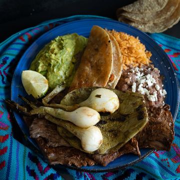 Grilled flank steak served with grilled onions, guacamole, cactus and chorizo bean taco, rice, beans and your choice of corn or flour tortillas.