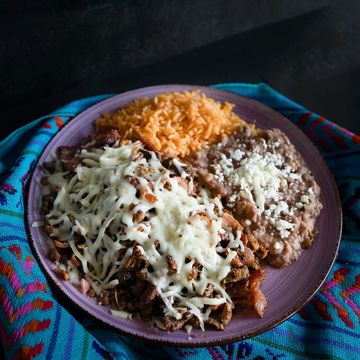 Steak, chorizo, ham & bacon cooked together with onions, bell peppers and then topped with melted chihuahua cheese, served with rice, beans and your choice of corn or flour tortillas.