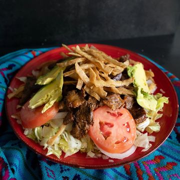 Thin-sliced steak, Iceberg lettuce, tomatoes, onions, avocado, fried tortillas strips with a chipotle cream dressing served on the side.