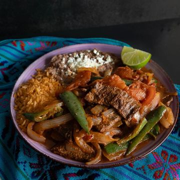 A thin-sliced steak grilled together with onions, tomatoes, jalapeños served with rice, beans and your choice of flour or corn tortillas.