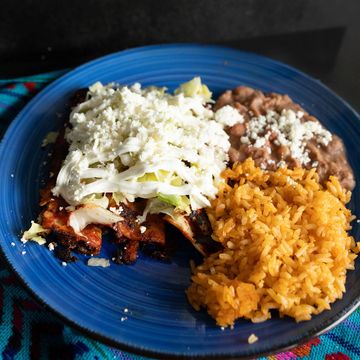 Corn Tortilla dipped in our red enchilada sauce then wrapped with chicken or cheese: topped with lettuce sour cream, queso fresco and served with rice and beans.