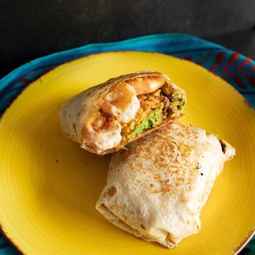 Large flour tortilla wrapped with choice of meat, grilled shrimp, rice, beans, sour cream and cheese