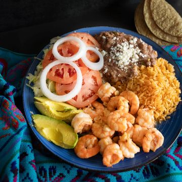 Shrimp cooked in garlic sauce: served with rice, refried beans and salad with your choice of corn or flour tortillas.