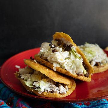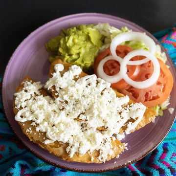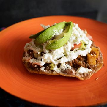Toasted tortilla topped with refried beans, your choice of meat, lettuce, tomatoes, sour cream, queso fresco and avocado